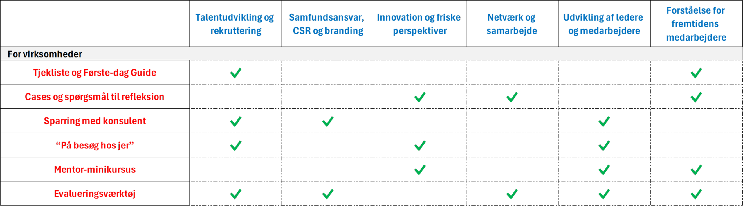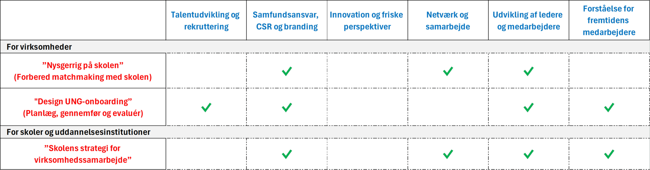 Vi bygger direkte videre på kommunens eksisterende rammer (matchmaking, gennemførsel, evaluering) og tilbyder moduler, der løfter både skoler og virksomheder yderligere.